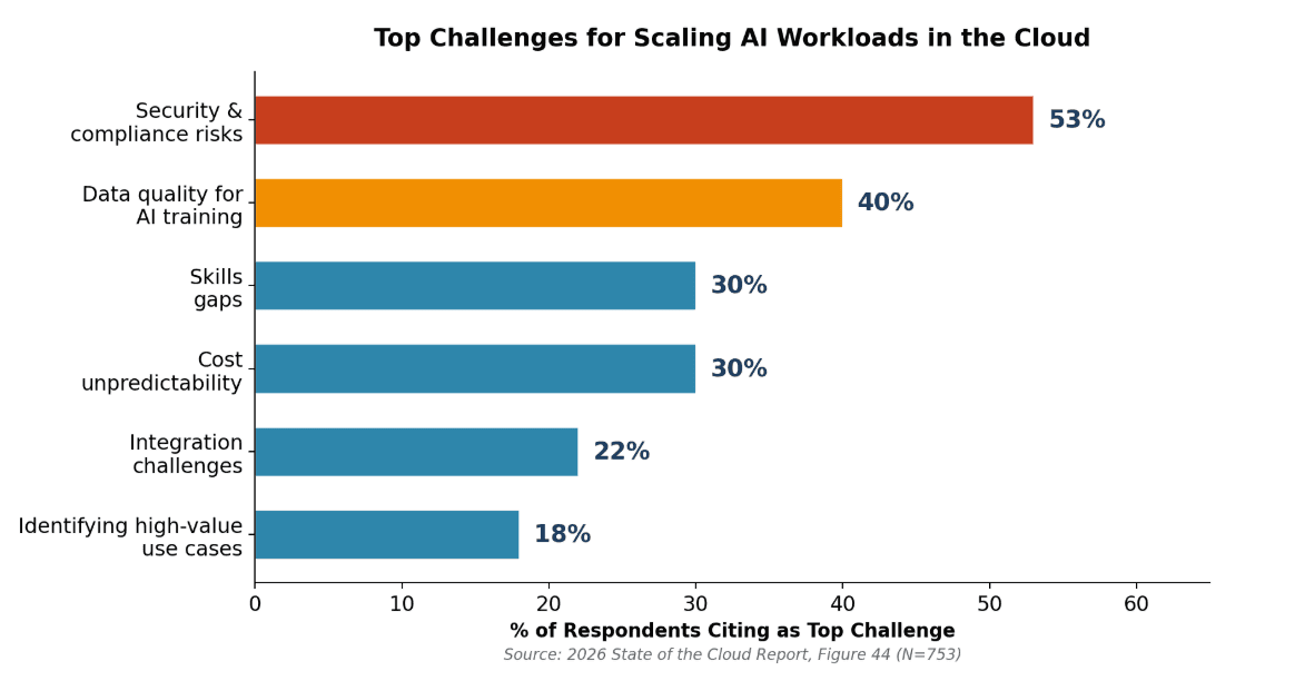 Security and compliance risks top the list at 53%. That number should not surprise anyone, but it should worry everyone. AI models introduce new attack surfaces, data residency concerns, and compliance headaches that traditional cloud workloads simply did not have.