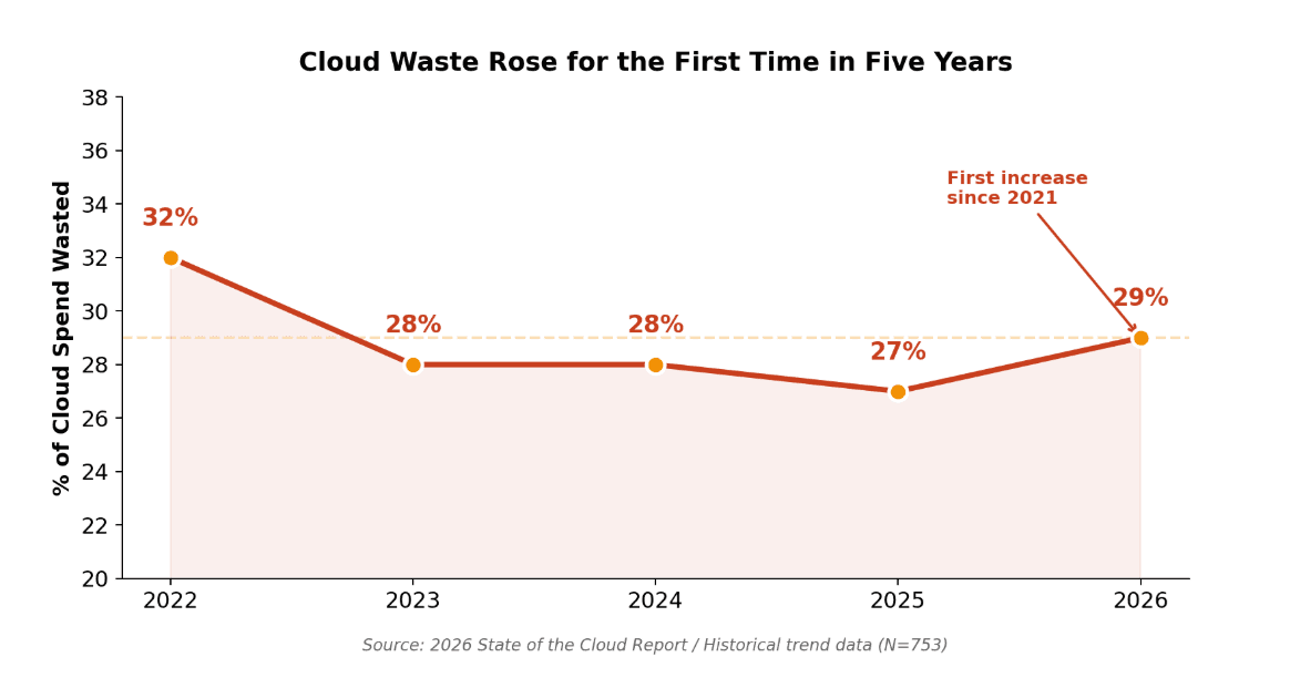 After five straight years of decline, wasted cloud spend ticked back up to 29% in 2026. That reversal is noteworthy on its own. But the story behind it is even more telling.
