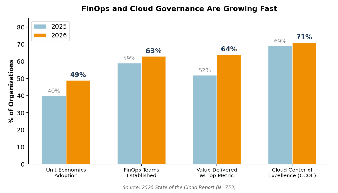 The numbers speak for themselves. CCOE adoption is at 71%, FinOps teams have grown to 63%, and nearly half of all organizations now use unit economics to connect spending to business outcomes. The value-delivered metric jumping twelve points in a single year is a particularly strong signal that FinOps is transitioning from a niche discipline into a core business function.