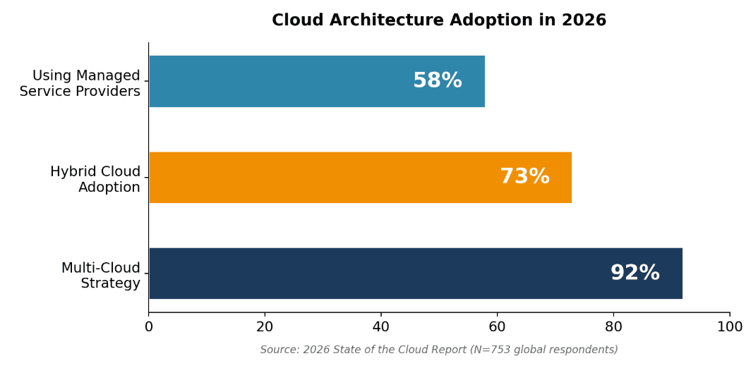 A full 73% of organizations now run hybrid environments, up three percentage points from last year. Multi-cloud is even more widespread at 92%, up from 89% in 2025. And 58% of organizations use a managed service provider to help manage their public cloud.