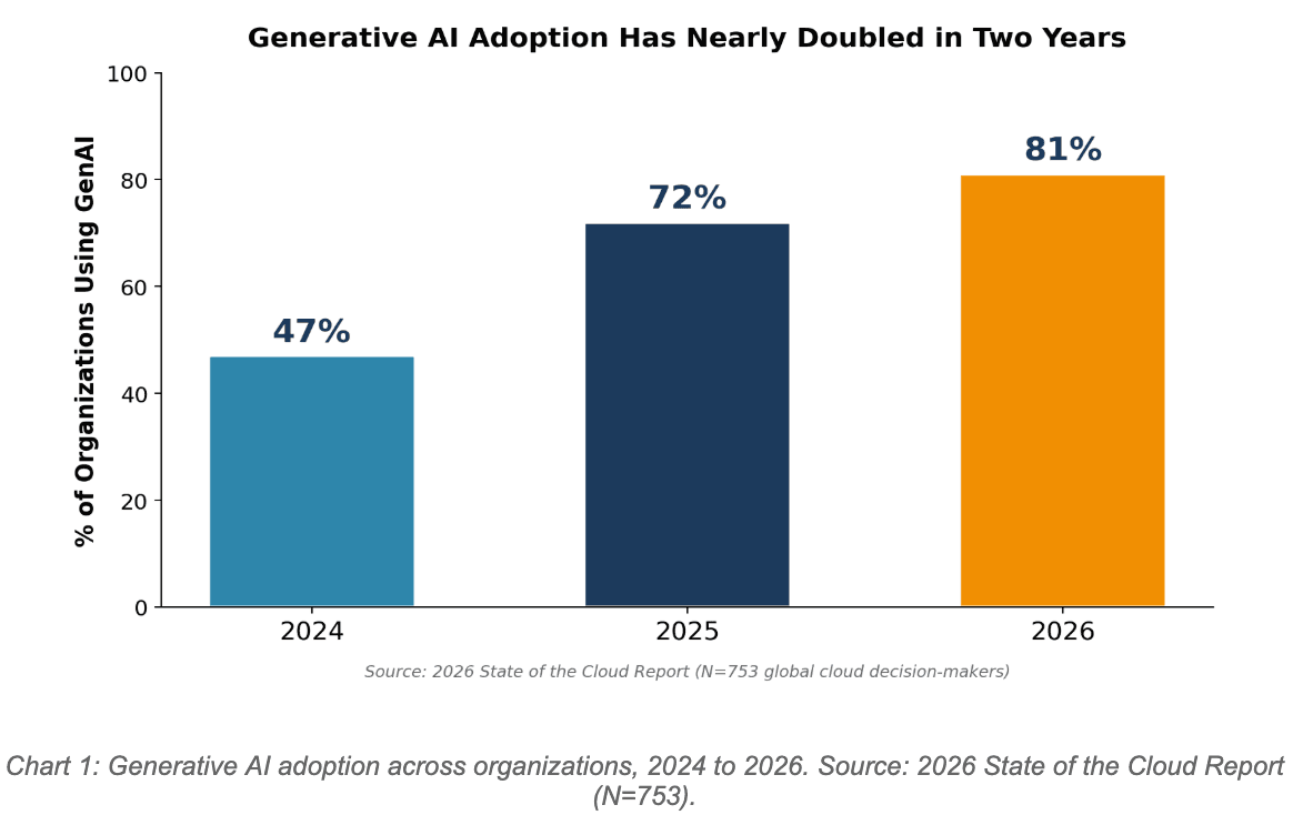 Look at that growth curve. We went from 47% in 2024 to 81% in 2026. And 45% of organizations now say they use GenAI extensively, up from 36% last year. GenAI has also climbed to become the third most widely used public cloud service, jumping from 50% to 58% year over year. That is the largest increase of any cloud service category.