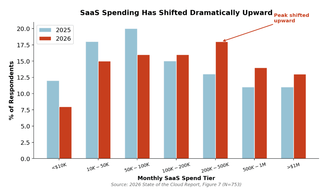 The most common monthly SaaS expenditure range has moved from $50,000 to $100,000 last year all the way up to $200,000 to $500,000 in 2026. Spending in the three lowest tiers dropped by a combined 7%, while spending in the top five tiers climbed by 9%.